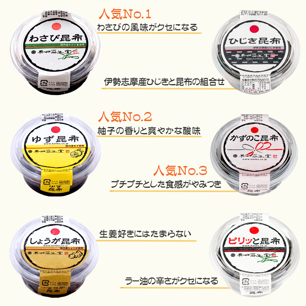 アレルギー情報 | わさび昆布:小麦、大豆、鶏肉を含む /ゆず昆布・しょうが昆布・かずのこ昆布・ひじき昆布:小麦、大豆を含む /ピリッと昆布:小麦、大豆、ごま、エビを含む |