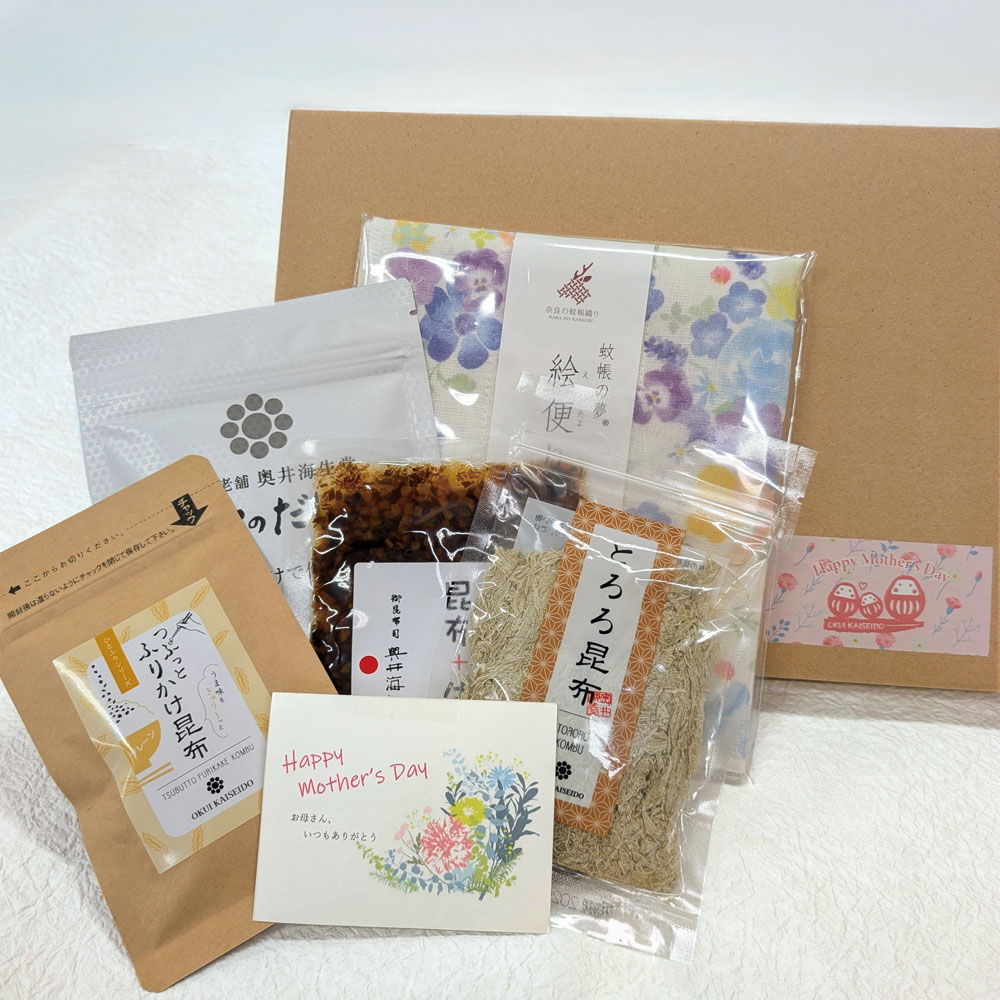 | 内容(容量) | 絵便りふきん(2種類よりどちらか1種)、昆布とかつおのだしパック10g×7包、昆布+生姜 袋入120g、とろろ昆布20g、つぶっとふりかけ昆布2g×5袋入り、母の日メッセージカード |