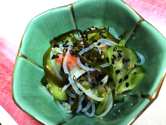 夏野菜と春雨を松葉炊き昆布でさっぱりと和えました。